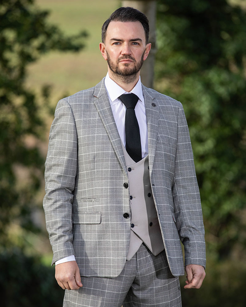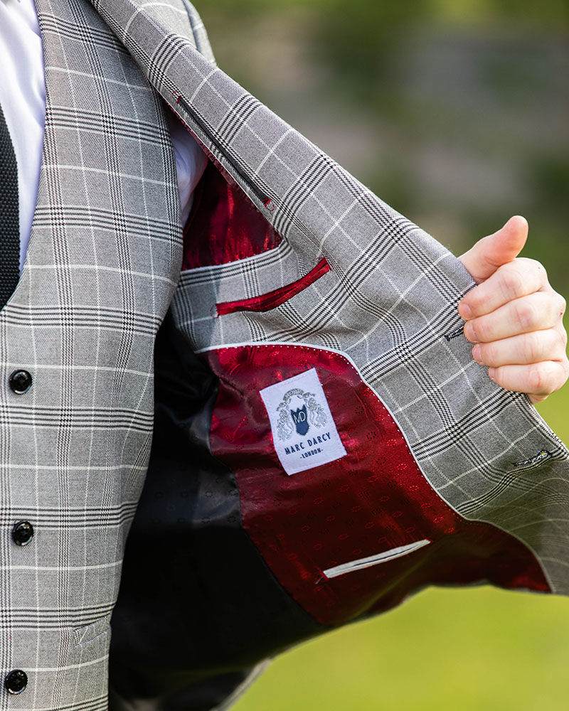 Marc Darcy Ross Grey check 3pc suit . can be worn with contrasting waistcoats and accessories